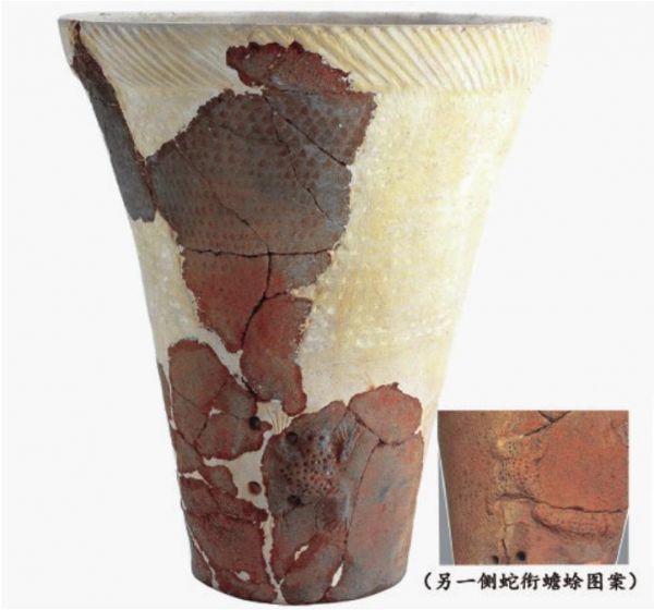 远古先民对蛇既畏惧又崇拜,在本次展览上,辽宁省文物考古研究院藏新石器时代的文物蛇衔蟾蜍筒形陶罐,充分反映了查海先民对蛇的崇拜与敬畏。这件文物可是拥有着“最早”的标签。它是在阜新查海遗址发现的,距今8000年,是中国迄今为止发现最早的蛇纹图案。这件夹砂黄褐陶敞口筒形罐,一面浮雕单只蟾蜍,另一面浮雕蛇衔蟾蜍,蟾蜍做四肢张开惊恐逃跑状,蛇张口衔住蟾蜍右下肢,作用力摆动尾部状,形象生动逼真、惟妙惟肖。