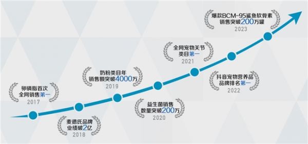 2021年,宠物关节类产品全网销售第一,直至2023年,麦德氏爆款BCM-95鲨鱼软骨素销售突破200万罐,成为宠物关节保健领域的现象级产品,进一步巩固了麦德氏的宠物关节专家地位。