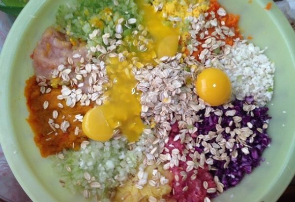 所有蔬菜、肉、鸡蛋、燕麦片、海藻粉放在一起搅拌均匀