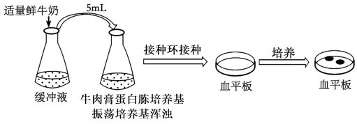 【推荐3】鲜牛奶易被金黄色葡萄球菌污染,该菌高度耐盐,在血平板(培养基中添加适量血液)上生长时,可破坏菌落周围的红细胞,使其褪色。下图为检测鲜牛奶是否被金黄色葡萄球菌污染的操作流程。回答下列问题: