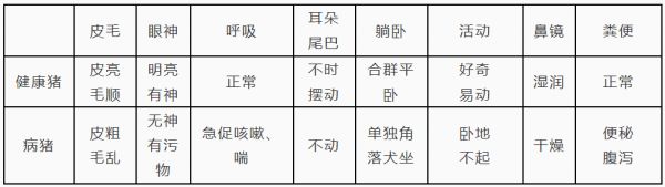 不健康的猪常常有以下特点:垂头夹尾、肤色苍白、精神沉郁、独处角落、四肢无力、颤抖、腹泻、便秘等。发现上述现象的猪,要及时隔离,测量体温,采取必要的治疗措施。