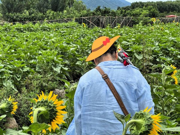 那天去南山下游玩,在花田里拍照,看到一只宠物鸟鹦鹉站在主人的肩膀上,自成风景。