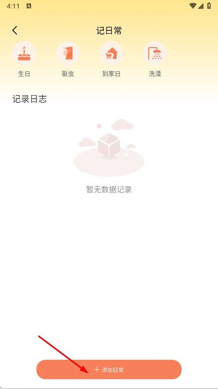 2、在记日常页,点加添加日常,选记录类型,如生日、驱虫等,若选其他日常,在输入框填内容。