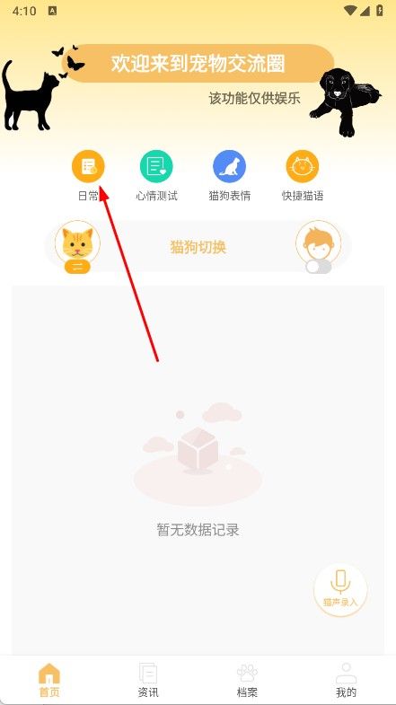 3、使用心情测试、猫狗表情等工具互动,借助日常记录、百科知识学习,解决养宠问题。