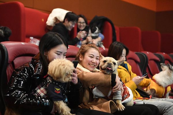 2018年农历新年之际,杭州的一家影院中,狗狗和主人一起迎接戊戌年的到来。