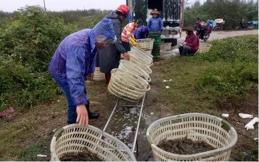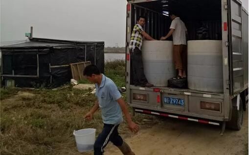 ▲ 早春投放的金鲳鱼苗,基本上都是几个养户约好一起定苗,然后由专业的鱼苗中介用车送到塘头
