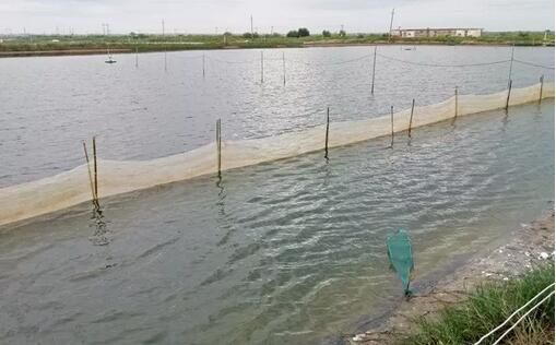 ▲ 用密网在池塘边上或一角围成一个框进行虾苗标粗(图示在围网内放地笼先将鱼虾清理到大塘再放虾苗标粗)