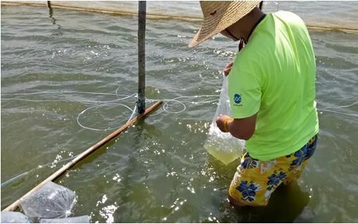 ▲ 正在放苗标粗(因为围网面积小,围网内一般用“小型充气泵+软管+气石”进行增氧)