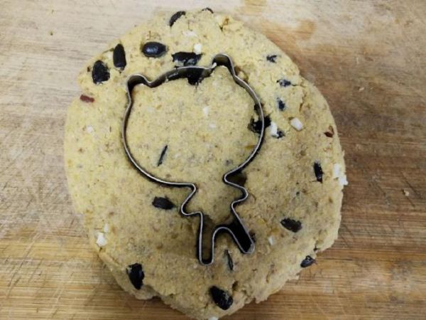 饼皮以营养均衡的混合粉(红枣,大麦,麸皮等特制饲料)为基本原料,铲屎官根据各家主子的喜好,制成不同软硬,不同形状的月饼坯,有纯手工揉制的,也有模具压制的,还有借鉴祖冲之测圆周率时用的“割圆术”切割成型的。