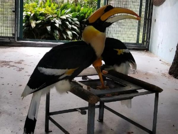双角犀鸟夫妇“欢欢乐乐”,享用月饼也不忘秀一下恩爱。
