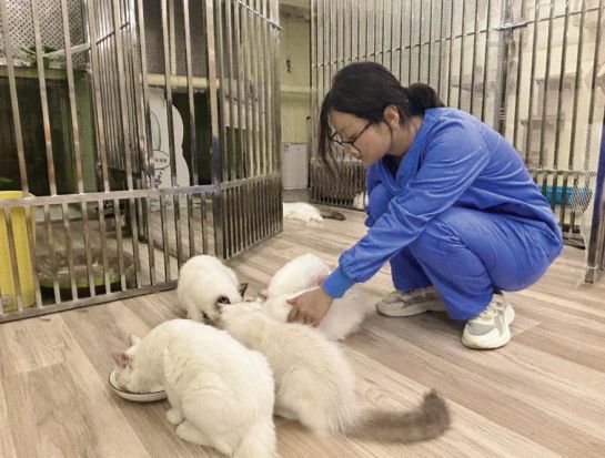 清理猫砂、清扫地面、更换宠物的食物与饮水、检查它们的健康状况……这些都是王秋月每天必做的工作。今年22岁的王秋月是一名动物医学专业的学生,目前在北京通州区的北方物一站式宠物服务中心担任宠物健康实习护理员。