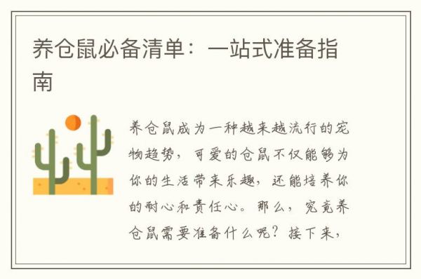 养仓鼠成为一种越来越流行的宠物趋势,可爱的仓鼠不仅能够为你的生活带来乐趣,还能培养你的耐心和责任心。那么,究竟养仓鼠需要准备什么呢?接下来,我们将为您提供一个一站式准备指南,帮助您轻松成为仓鼠的主人。