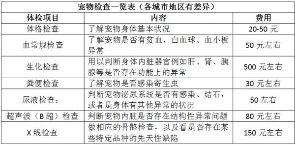 以下是各项宠物体检项目的费用概况,当然不同的地区也会有所区别,具体还是要以各地的标准为准哦,兽医小明只能提供一个参考意见。