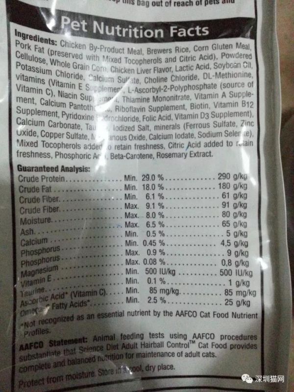 配料表和营养比:是猫干粮包装背后必需标明的两个内容,了解一款猫粮主要靠这些信息。如果你手中的猫粮产品没有注明这两样信息,请果断放弃它。