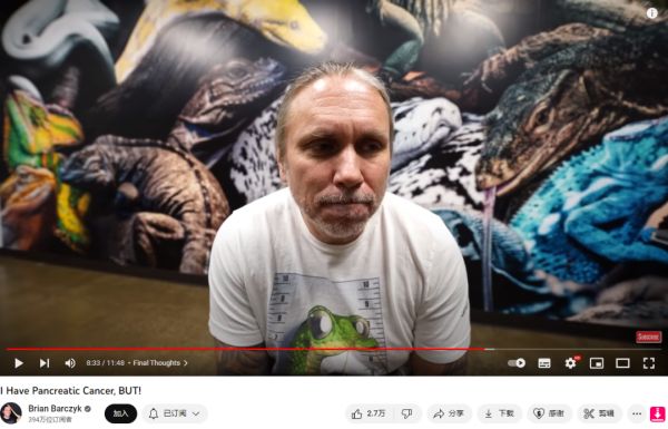 与此同时,布莱恩还坚持写作,专门腾出一些时间帮助那些爬宠出问题的朋友,不遗余力的宣传爬宠文化。目前,他自己的 YouTube 频道已经积累了500万的粉丝,他通过有趣的方式制作着爬行动物科普视频,成为了海外家喻户晓的爬宠圈大神,并影响了一批又一批的年轻人热爱爬宠。#02确诊胰腺癌开启化疗之路