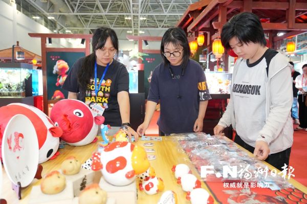 2025福鱼大赛的展厅里,除了游动的金鱼,色彩明快的文创产品同样吸引了不少观众驻足。在潘氏金鱼的展位上,憨态可掬的金鱼抱枕、呆萌可爱的陶瓷冰箱贴、造型灵动的树脂手办整齐摆放,这些以福州传统金鱼为灵感的设计,大多出自江夏学院的一群学生之手。