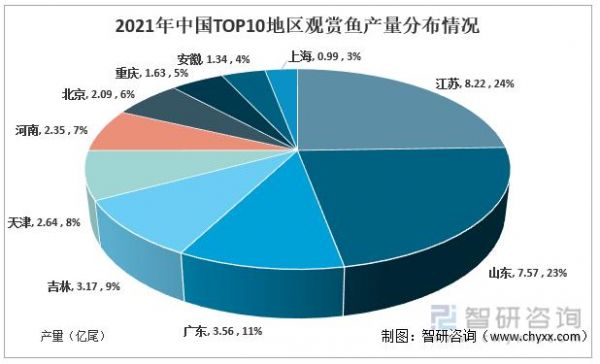 2021年中国TOP10地区观赏鱼产量的分布情况