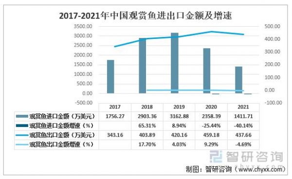 2017-2021年中国观赏鱼进出口金额及增速