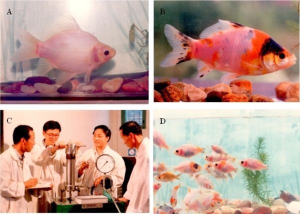 中科院院士、水生生物研究所研究员桂建芳团队对鲫开展了多年研究。金鱼作为四倍体鲫的突变体,20世纪80年代,桂建芳在金鱼的原始品种草金鱼中发现了体色透明的突变体(图A)。在此基础上,将这条突变体和红鲫杂交,其后代体色透明,内脏和骨骼清晰可见,且分布有不同彩色花斑,被称为“水晶彩鲫”(图B)。1986年,桂建芳团队用静水压的方法对“水晶彩鲫”进行多倍化诱导,创制出染色体加倍后仍保持有透明和鲜艳体色的人工合成六倍体“水晶彩鲫”(图D)。
