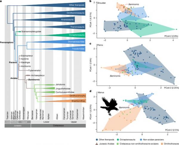 研究团队还通过贝叶斯定年分析推测,鸟类的起源时间可以追溯到中侏罗世晚期(约 1.72-1.64 亿年前)。如果考虑到同地点发现的叉骨确实属于今鸟型类,那么鸟类的起源时间可能还要进一步提前到早侏罗世晚期。这一时间估计比此前的认知要早得多。