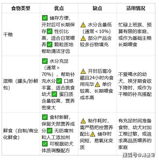 选择适合幼犬的食物是保证健康成长的关键,以下从优点、缺点、适用情况三个维度对比目前主流的三种食物类型,帮助你做出更贴合实际的选择:
