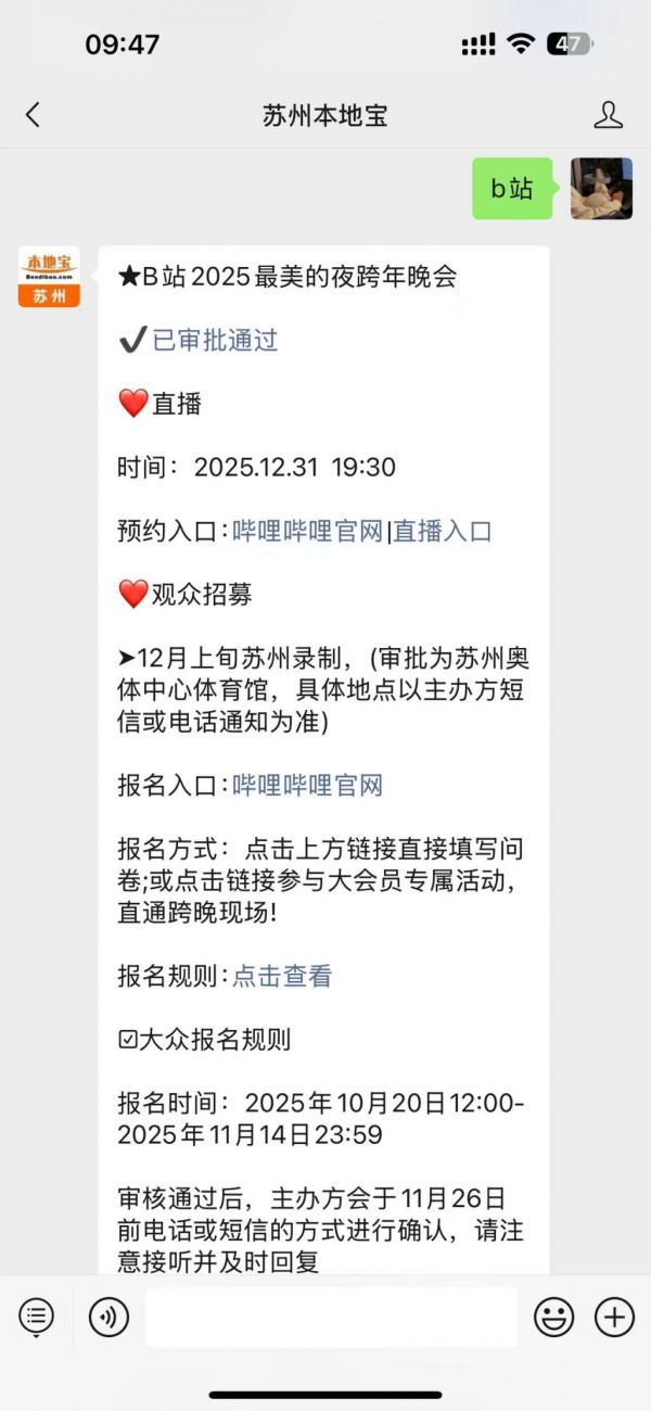 温馨提示:微信搜索公众号【苏州本地宝】,关注后在对话框回复【b站】即可获得2025年哔哩哔哩跨年晚会观众招募报名时间/入口/规则、录制时间地点、直播预约/观看入口等信息