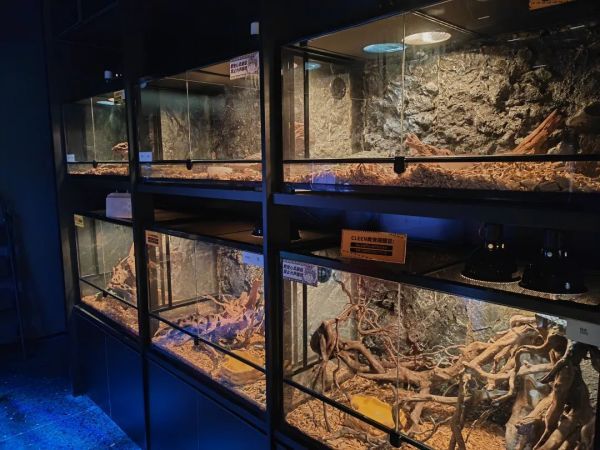 店面不大,大约150-170平米,主要展示角蛙、玉米蛇、王蛇、斑帆、蓝舌和守宫等。店内的布局让人感觉像是在逛博物馆,特别的壮观。为了营造这种效果,店内靠墙放置了不同大小的爬宠箱,顶面有深色反光板,通过镜像效果增加纵深感。店内使用暖色调灯光(实际上是爬宠的加热灯),营造了一个集中而暗沉的氛围,让人更加专注于爬宠箱内的展品。
