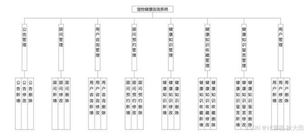 宠物健康咨询系统系统在进行系统中功能模块的划分时,采用层次图来进行表示。层次图具有树形结构,它能使用矩形框来描绘数据信息。顶层代表的数据结构很完整,顶层下面的矩形框表示的数据就是子集数据,当然处于最下面的矩形框就是不能再进行细分的数据元素了,使用层次方框图描述系统功能能让用户一目了然,能够明白系统的功能,以及对应功能板块下面的子功能都可以清楚领会。宠物健康咨询系统分为管理员和用户两部分操作角色,下面将对他们的功能进行阐述。