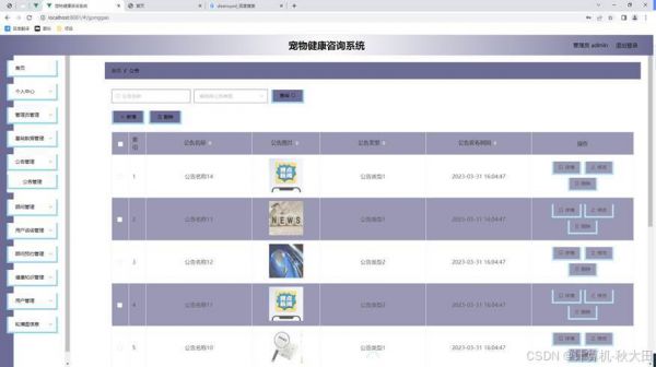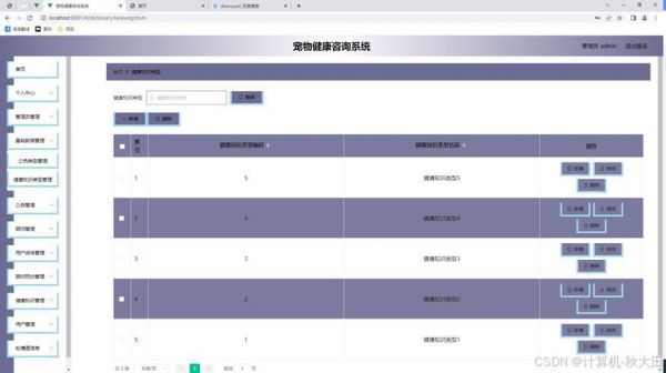 如图5.1显示的就是宠物健康知识列表页面,此页面提供给管理员的功能有:查看宠物健康知识、新增宠物健康知识、修改宠物健康知识、删除宠物健康知识等。