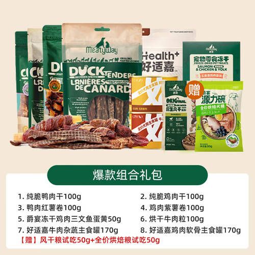 为了让您和您的爱宠尽快体验到这款爆款组合礼包,我们为您准备了丰富的产品组合,包括100g果肉干、100g鸭肉红薯卷、100g鸡肉干、100g鸡肉紫薯卷、50g鸡肉三文鱼蛋黄、100g牛肉粒等,甚至还有赠品:50g风干粮试吃、20g OK洁齿骨*2支,确保您的宠物在享用美味的同时,也能获得全面的营养。