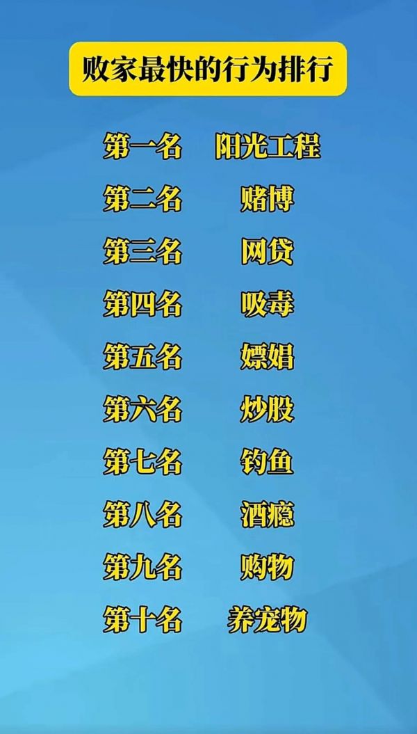 你能想象吗?钓鱼、养宠物,这些看似平常的爱好,居然被列入了最败家的十大行为之中。阳光工程赫然排在首位,确实,很多打着阳光工程旗号的项目,实则是陷阱,让人血本无归,排第一实至名归。