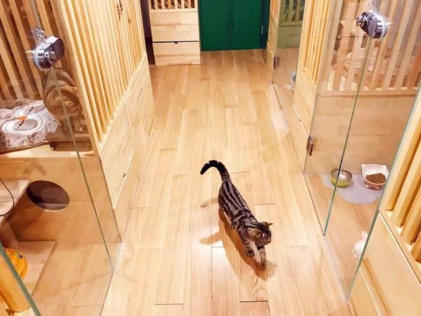 每个房间内,抽屉式的猫砂盆在长方体底座下,新风系统的风口位于房间顶部,还有实木栅栏和钢化玻璃门保证了空间的通透感。