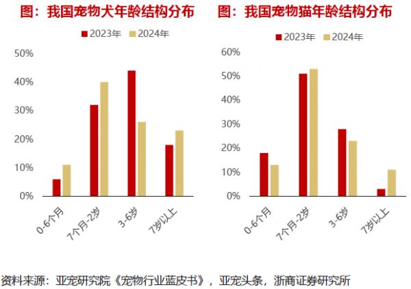 尽管国内养宠规模庞大,但目前宠物群体的年龄结构仍相对年轻。亚宠研究院数据显示,2024年我国7岁以上的犬只占比不到30%,7岁以上的猫占比不足20%,其中2岁以下的猫更是高达66%。