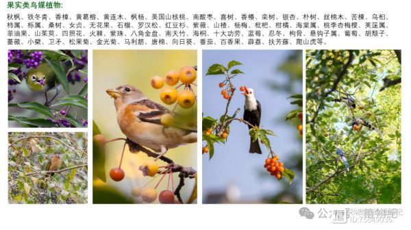 a.果实类:丰富果实类型,如浆果、坚果植物,选择果期长、果量多的树种,重点关注鸟类冬春季食物短缺问题。