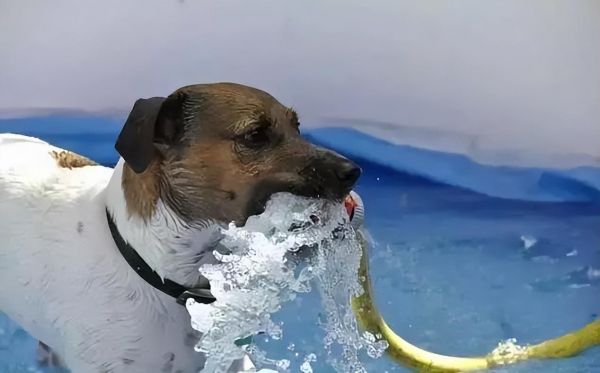 在泳池里上蹿下跳,咬着水管边喝边玩