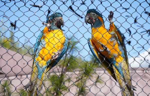 主题乐园内的两只蓝喉金刚鹦鹉(央广网记者 杨正弘 摄)