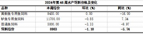 据市农业农村委监测,第46周水产饲料均价8983元/吨,环比稳中略跌1.10%,同比下跌5.74%,其中黄颡鱼专用鱼饲料、鲈鱼专用鱼饲料均平稳,普通鱼饲料下跌3.33%。