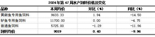据市农业农村委监测,第47周水产饲料均价9019元/吨,环比上浮0.40%、表现平稳,同比下跌9.96%,其中黄颡鱼专用鱼饲料稳中略涨1.94%,鲈鱼专用鱼饲料平稳,普通鱼饲料稳中略跌1.29%。