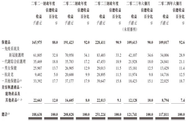保健品,主要在自有品牌下销售,包括「草姬(Herbs)」、「绿康营(Regal Green)」、「梅屋(Umeya)」、「男补(Energie)」、「男极(Men’s INFiNiTY)」及「正统(Classic)」。涉及免疫系统及新冠后护理的保健品为公司主要产品类别之一,主要产品主要包括「草姫第4代虫草CS4」及「草姫灵芝孢子」。