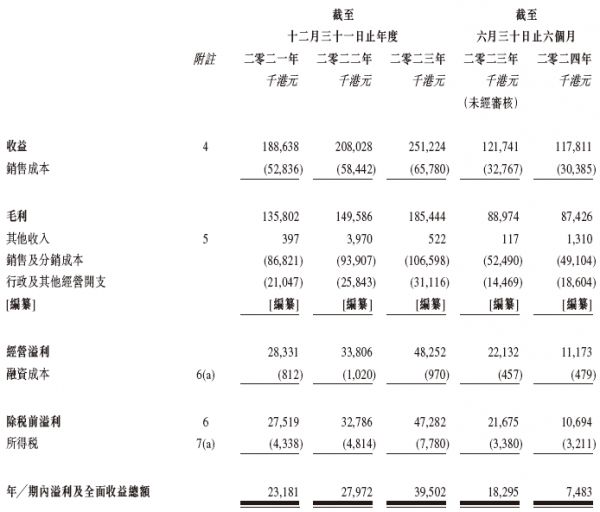 招股书显示,在过去的2021年、2022年、2023年和2024年上半年,草姬集团的营业收入分别为1.89亿、2.08亿、2.51亿和1.18亿港元,相应的净利润分别为2318.1万、2797.2万、3950.2万和748.3万港元。
