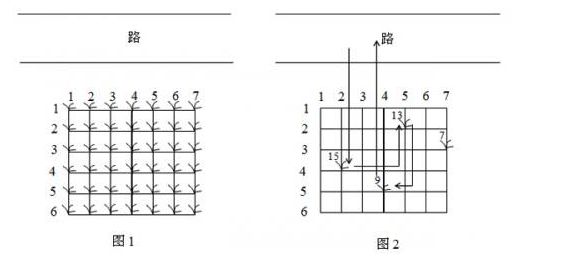 鲁宾逊先生有一只宠物猴,名叫多多。这天,他们两个正沿着乡间小路散步,突然发现路边的告示牌上贴着一张小小的纸条:“欢迎免费品尝我种的花生!——熊字”。 鲁宾逊先生和多多都很开心,因为花生正是他们的最爱。在告示牌背后,路边真的有一块花生田,花生植株整齐地排列成矩形网格(如图1)。