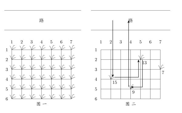 鲁宾逊先生和多多都很开心,因为花生正是他们的最爱。在告示牌背后,路边真的有一块花生田,花生植株整齐地排列成矩形网格(如图一)。有经验的多多一眼就能看出,每棵花生植株下的花生有多少。为了训练多多的算术,鲁宾逊先生说:“你先找出花生最多的植株,去采摘它的花生;然后再找出剩下的植株里花生最多的,去采摘它的花生;依此类推,不过你一定要在我限定的时间内回到路边。”