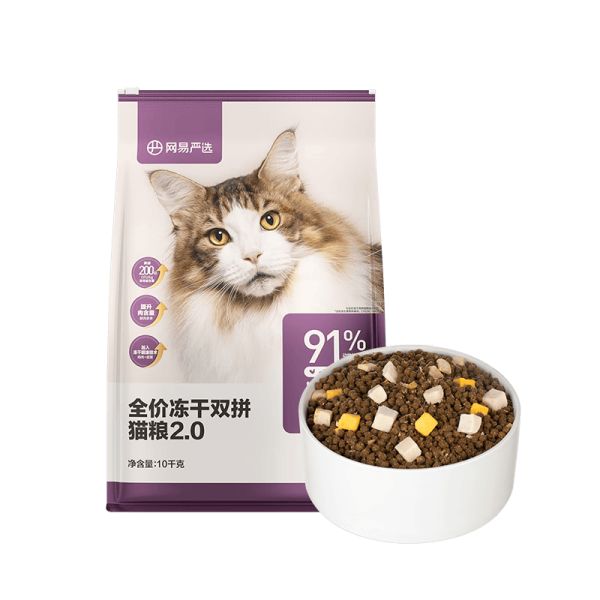 网易严选全价冻干双拼猫粮:这款猫粮专为幼猫设计,含有超过75.6%的高鲜肉,添加了200亿益生菌,确保猫咪的肠道健康。它的粗蛋白含量达到44%,并且承诺不添加谷物和诱食剂,适合对饮食成分敏感的猫咪。