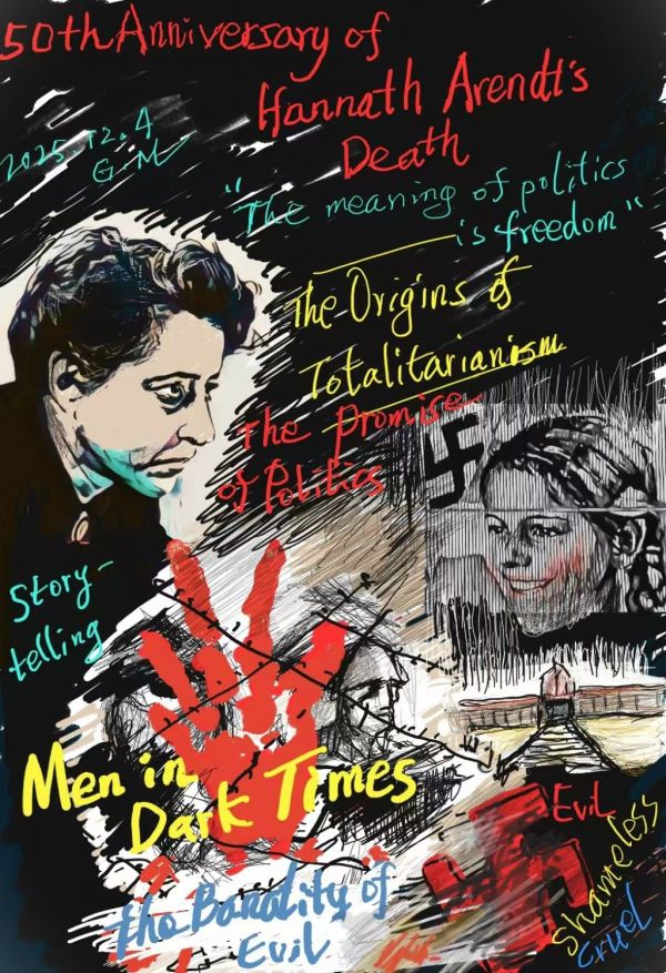 图1 阿伦特逝世50周年纪念:她捍卫人性的尊严 手机手绘 + 拼贴 李公明作 2025年12月4日