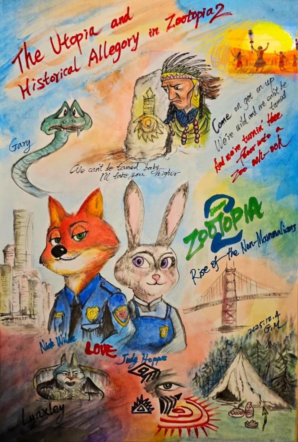 图2 疯狂动物城2的乌托邦与历史隐喻 纸本彩墨 65cmX45cm 李公明作 2025年12月4日