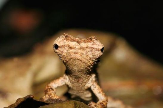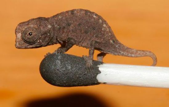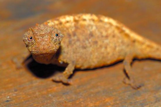 这只迷你的枯叶变色龙全身加起来才2.5厘米,经常躲在枯叶下面来伪装成自己是叶子的一员,来蒙骗别人,还很会装死。但是这只迷你的变色龙的舌头比全身都长,这才能让它扑食到飞蛾之类的。
