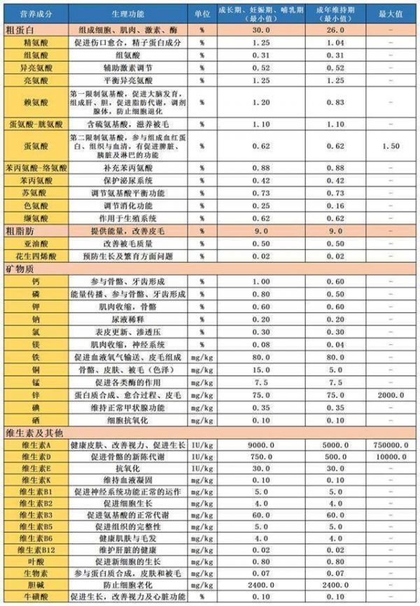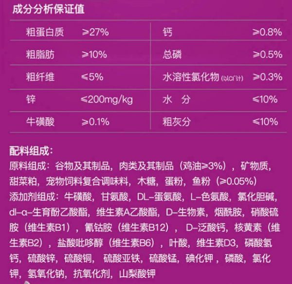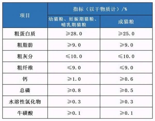 粗蛋白≥30% 粗脂肪≥9% 牛磺酸≥0.10% 钙磷比不能高于2:1同时也不能低于1:1