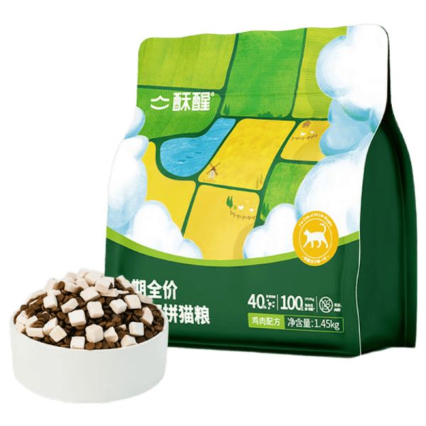接下来要介绍的是酥醒幼猫成猫冻干双拼全价猫主粮,拥有高达40%的粗蛋白质,确保猫咪的活力与健康。这款猫粮采用了100亿CFU/kg的布拉氏酵母菌,能够有效护肠,帮助消化,适合各个年龄段的猫咪。
