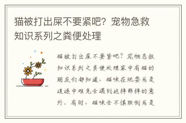 猫被打出屎不要紧吧?宠物急救知识系列之粪便处理 家中有猫的朋友们都知道,猫咪在玩耍或是追逐中难免会遇到这样那样的意外。有时,猫咪会不慎跌倒或是与家具相撞,甚至打翻了垃圾桶,导致拉出粪便。这时候,许多主人会担心猫咪的健康和安全问题。本文将从宠物急救的角度,为大家解答“猫被打出屎不要紧吧?”这个问题,并分享一些宠物粪便处理的小技巧。