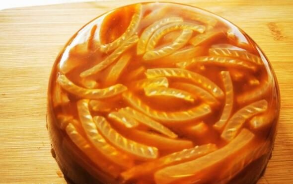 11、待完全冷却后,用密封盒或封好保鲜膜(保鲜袋)放入冰箱冷藏。吃的时候用小刮板沿着容器边缘走一圈,使皮冻与容器壁分离,倒扣就很容易出来了。
